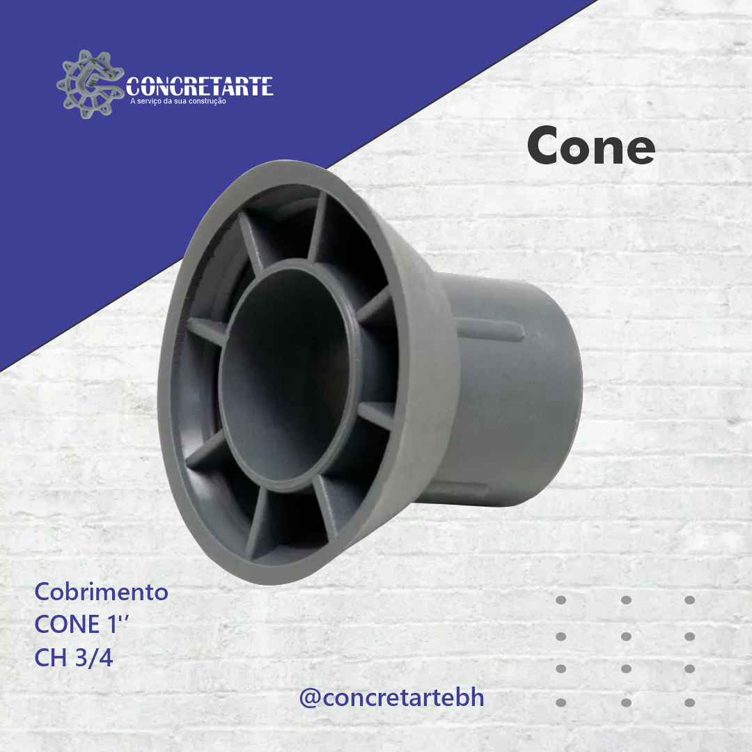 É utilizado nas extremidades do tubo de ¾, fixando através de encaixe.Protege o sistema de travamento da forma (barra roscada).O cone auxilia no fechamento paralelo das formas, sendo resistente para suportar as solicitações de fechamento.